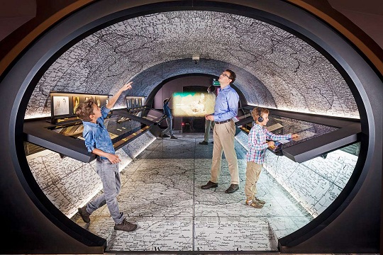 이 지하 박물관에서는 주요 전시실에서 다른 전시실로 이동할 때 다리를 건너야 하는데, 다리의 바닥이 유리로 되어 있어 아래쪽에 있는 중세 건축물과 포장도로를 볼 수 있습니다. 통로를 따라가다 보면 ‘부(富)의 좌판(Wealth Stalls)’과 12세기에 만들어진 더욱 오래된 좌판들을 지나치게 됩니다.